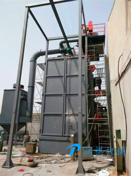 本機工作時,當(dāng)準(zhǔn)備工作(除塵系統(tǒng)、分離器提升機、螺旋輸送器等運行)完畢后,機器開始正常工作。首先,電動葫蘆在室體外裝上工件后吊起,將工件開進清理室,當(dāng)?shù)竭_拋丸工位時,大門開始關(guān)閉,工件開始自轉(zhuǎn),此時打開拋丸器,開供丸閘,開始對工件進行拋丸清理,清理一段時間后,關(guān)閉供丸閘門,關(guān)閉拋丸器,關(guān)閉除塵系統(tǒng),打開大門,工件吊出室體卸件。重復(fù)上述過程直至工作完畢,按順序停機。